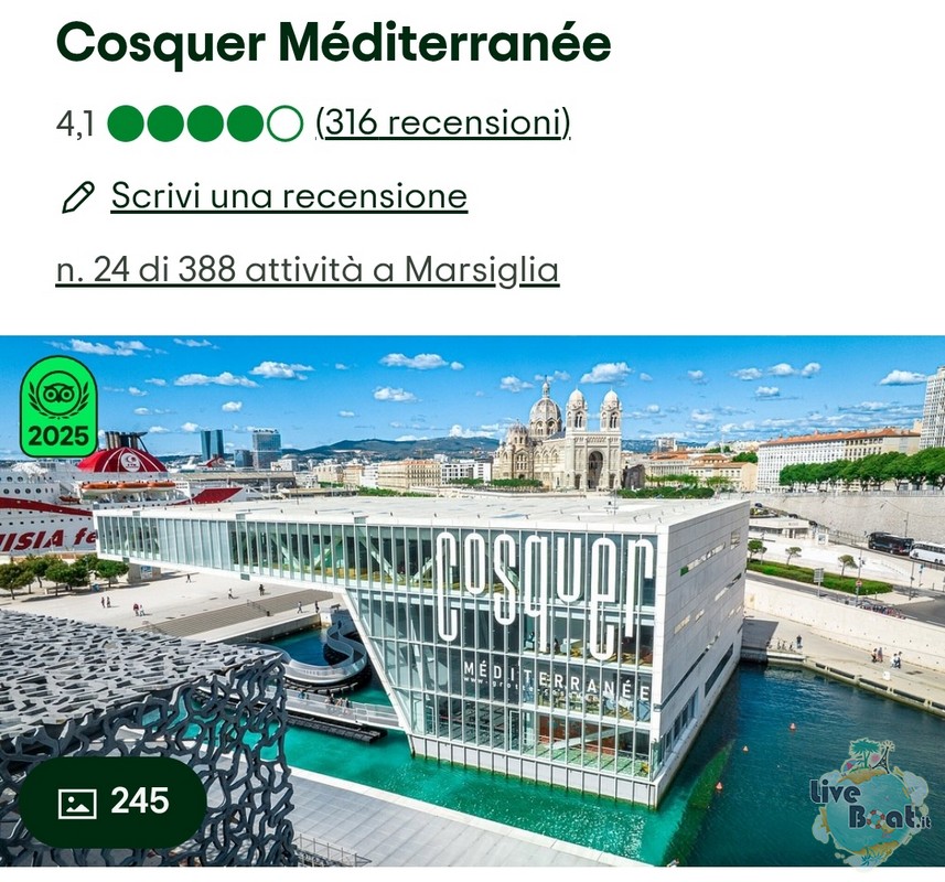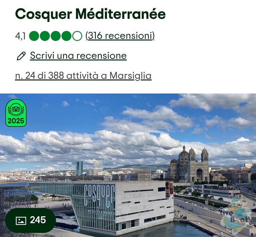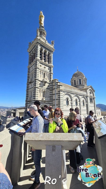 Un suggerimento per chi non lo avesse visitato: Cosquer Méditerranée. Si trova dove lasciano le navette della nave, ma potreste anche raggiungere il centro utilizzando Uber. Circa 16 euro se siete in 4 diventa conveniente, la navetta MSC 17 a persona. Con Uber vi potrete anche far portare in centro storico e se vi piace fare un giro nel vivace quartiere arabo. Alternativa valida il trenino con due diversi itinerari. Oppure dal centro guardando la u del porto sul lato destro partono i bus cittadini che portano sulla collina alla chiesa di Notre Dame de la Garde.