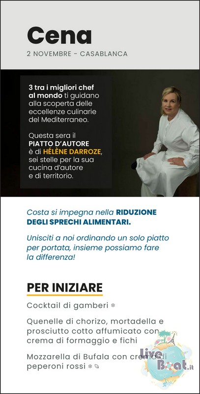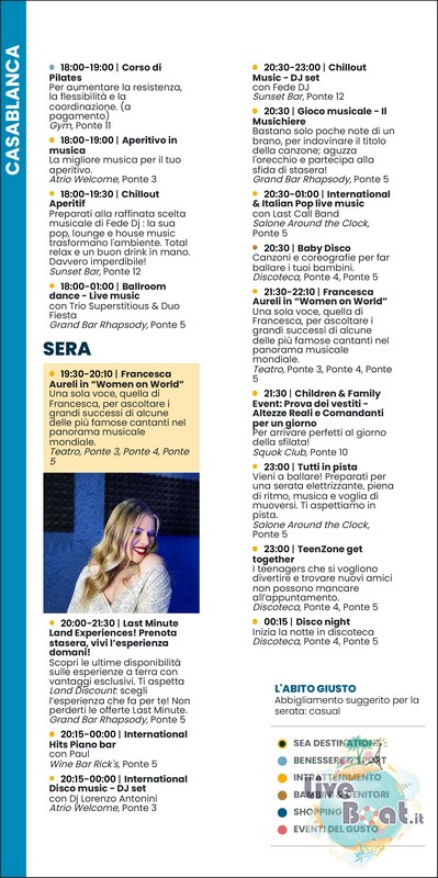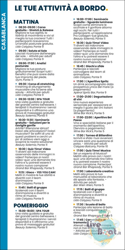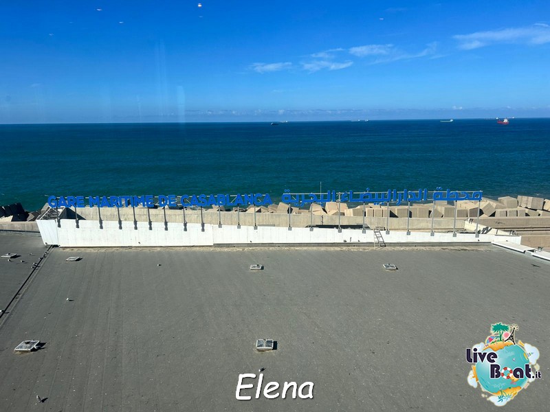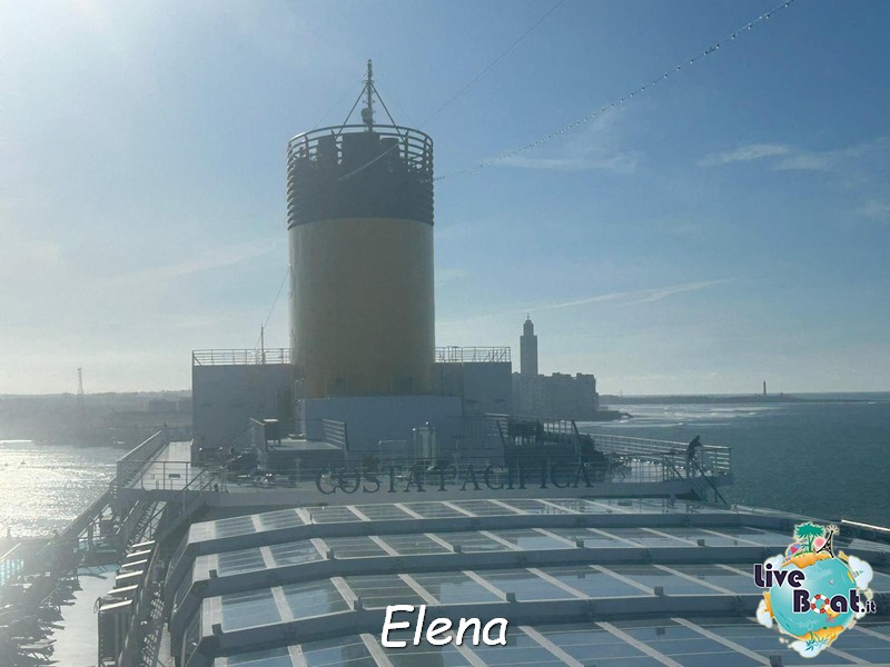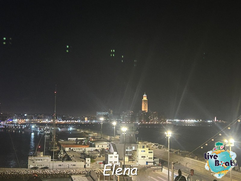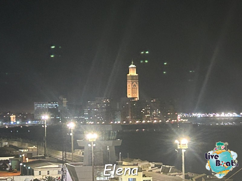 Poi preso un po’ di sole a ponte 14. Poco prima di cena, visto che Costa Pacifica stava per partire, siamo saliti a ponte 11 a poppa per salutare Casablanca di sera.