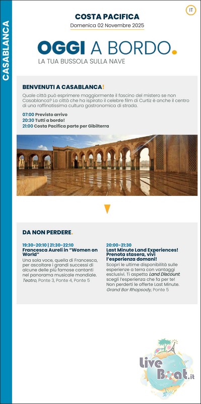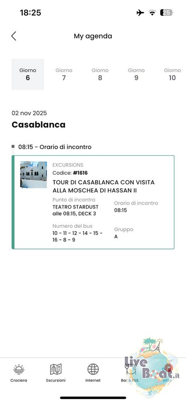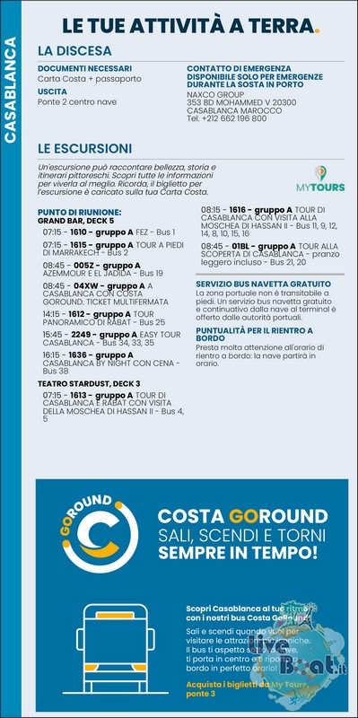 La nostra guida, Zaccaria, ci ha portati prima al mercato delle olive, poi in una grandissima piazza, in un grande centro in cui si vendevano prodotti artigianali, poi a visitare la Moschea di Hassan II e infine sul lungomare prima di rientrare intorno alle 13:15 in nave. La Moschea ci ha lasciati completamente a bocca aperta, immensa, meravigliosa, una delle strutture più belle e imponenti che io abbia visitato. Del resto è la terza moschea più grande al mondo. È quasi impossibile credere che sia stata costruita in soli 6 anni. Escursione veramente bella, merito anche della guida che è stata ineccepibile.