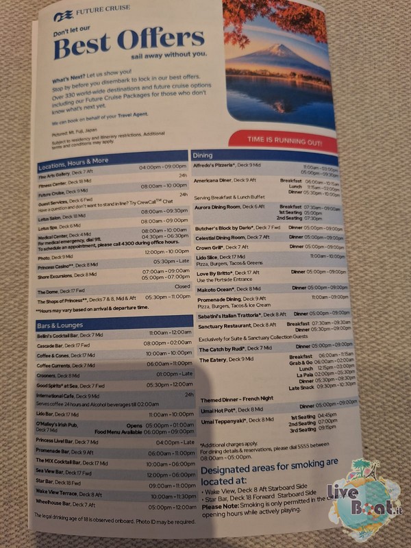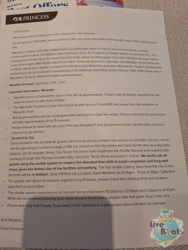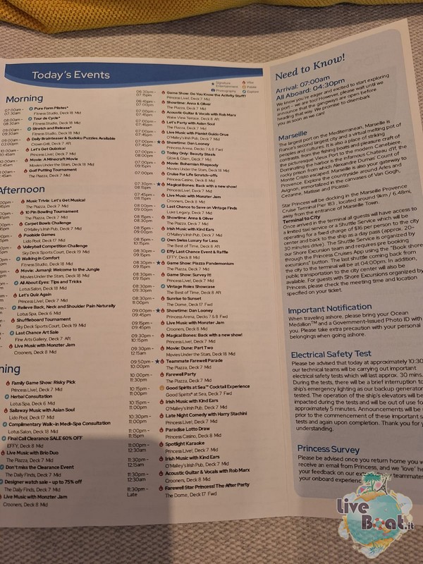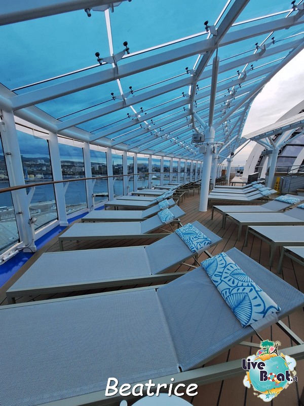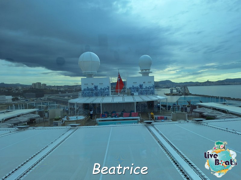 Bonjour à tous depuis Marseille! Marsiglia è un altra città molto conosciuta dai Crocieristi, ma al contrario di Barcellona io non la amo particolarmente. Diciamo che è carina si, ma ormai è rimasta senza sorprese. Quindi non siamo scese. Dopo colazione abbiamo preparato le valigie… ormai è giunto il momento… poi un giretto sui ponti esterni. Ora siamo nella stupenda piscina a Prua, sotto la magnifica cupola del Dome a rilassarci e a farci l’ultimo bagno. Il tempo non è splendido ma qui è ben riparato e si sta bene!
